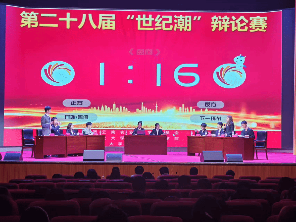 为激发学生思辨能力、深化对社会议题的理性探讨,由共青团云南农业大学委员会主办,经济管理学院承办的云南农业大学第二十八届“世纪潮”辩论赛决赛在校友会堂举行。2025年5月29日晚,冠亚季军争夺赛相继展开,茶学院、水利学院、农学与生物技术学院、经济管理学院四支学生辩论队伍齐聚校友会堂,围绕两大议题展开激烈辩论,呈现了一场思辨盛宴。